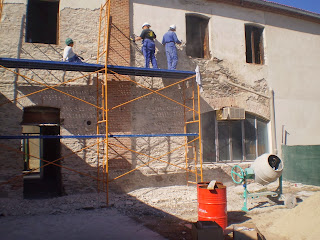 Dentro de los trabajos que tenemos que realizar está el revoco de la fachada posterior del edificio, aprovechando el buen tiempo colocamos andamios y picamos la fachada, en estas fotos puede verse el trabajo.