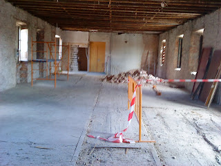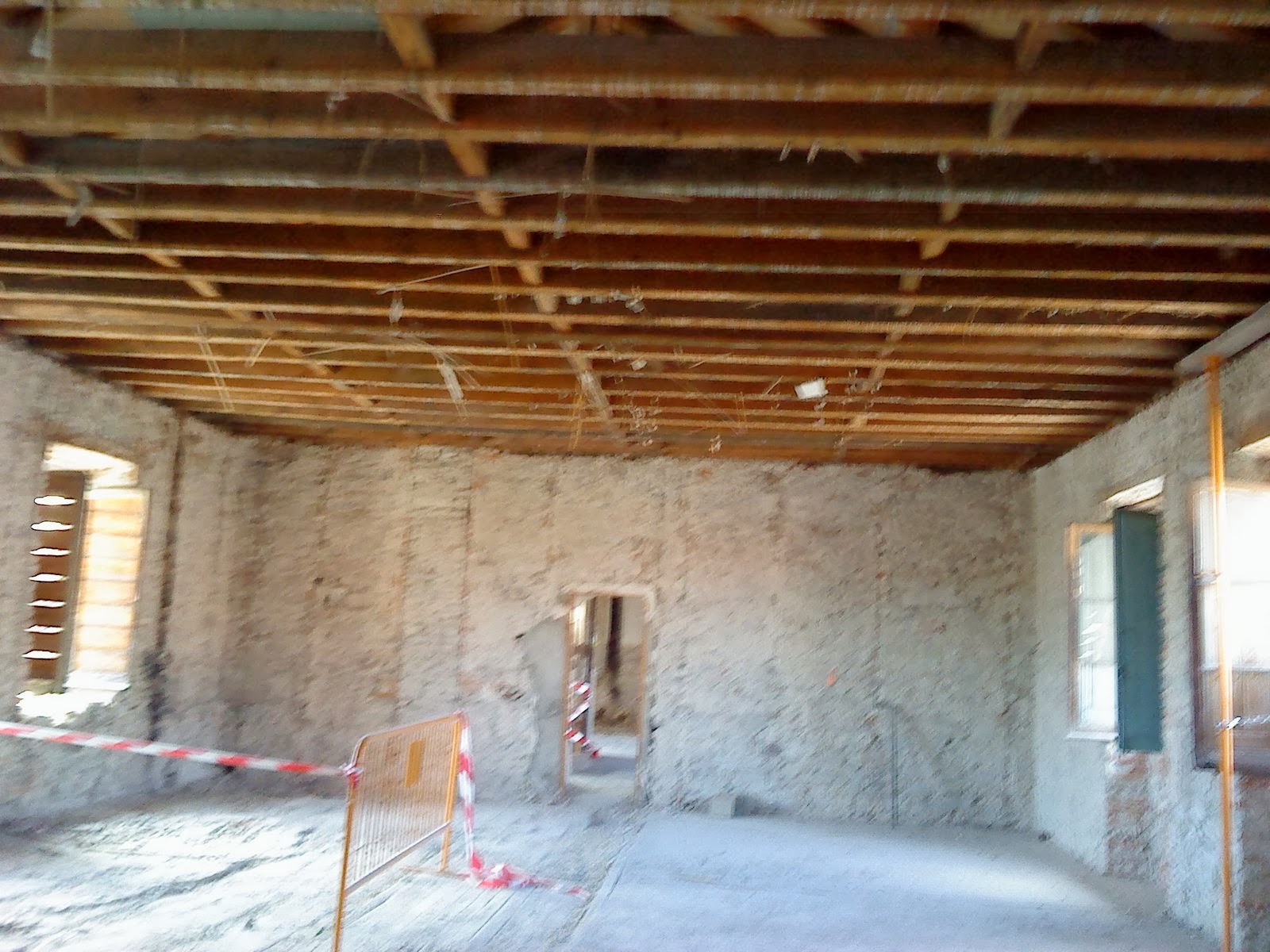Tras tomar un café seguimos quitando la tarima y las vigas del forjado, lo que constituía el techo del salón rosa y seguimos trabaabdo en la reforma del baño del Ciber.