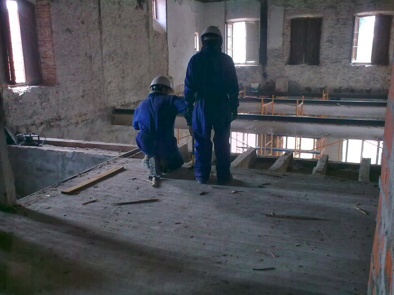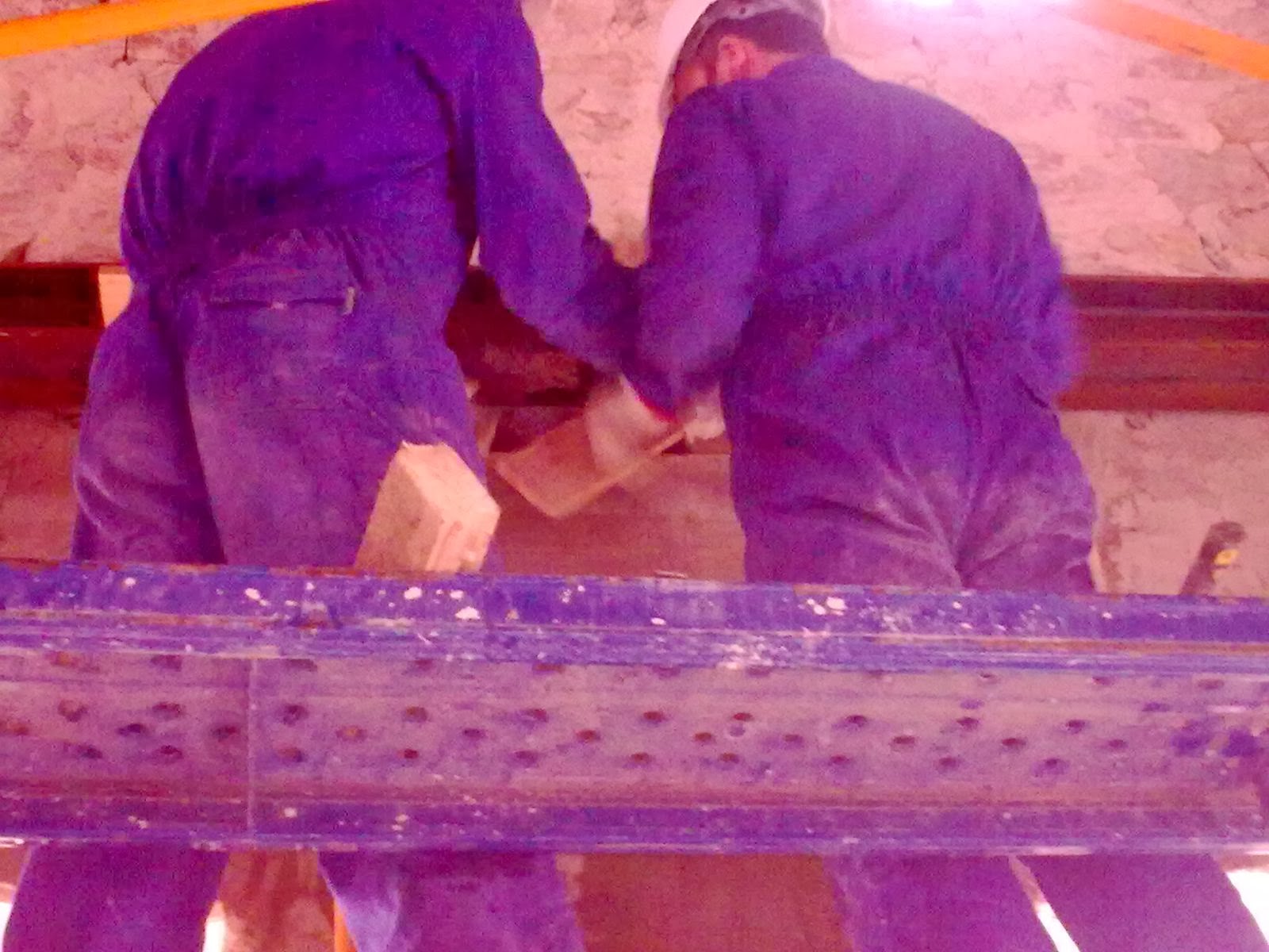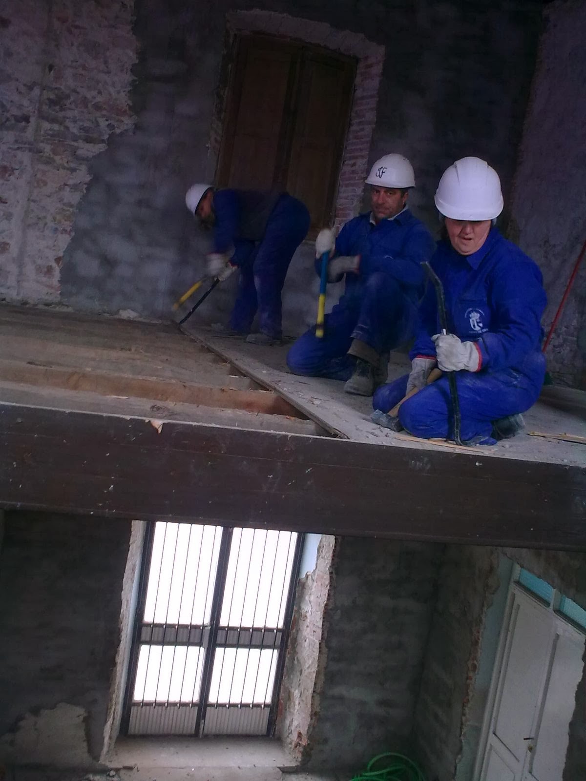En clase seguimos con Los Morteros, en la obra el soldador suelda las vigas que hemos montado a las existentes, demolemos el muro de la escalera y procederemos a levantar la tabla de la tarima de la escalera y ha recibir los apoyos de las vigas al muro.
