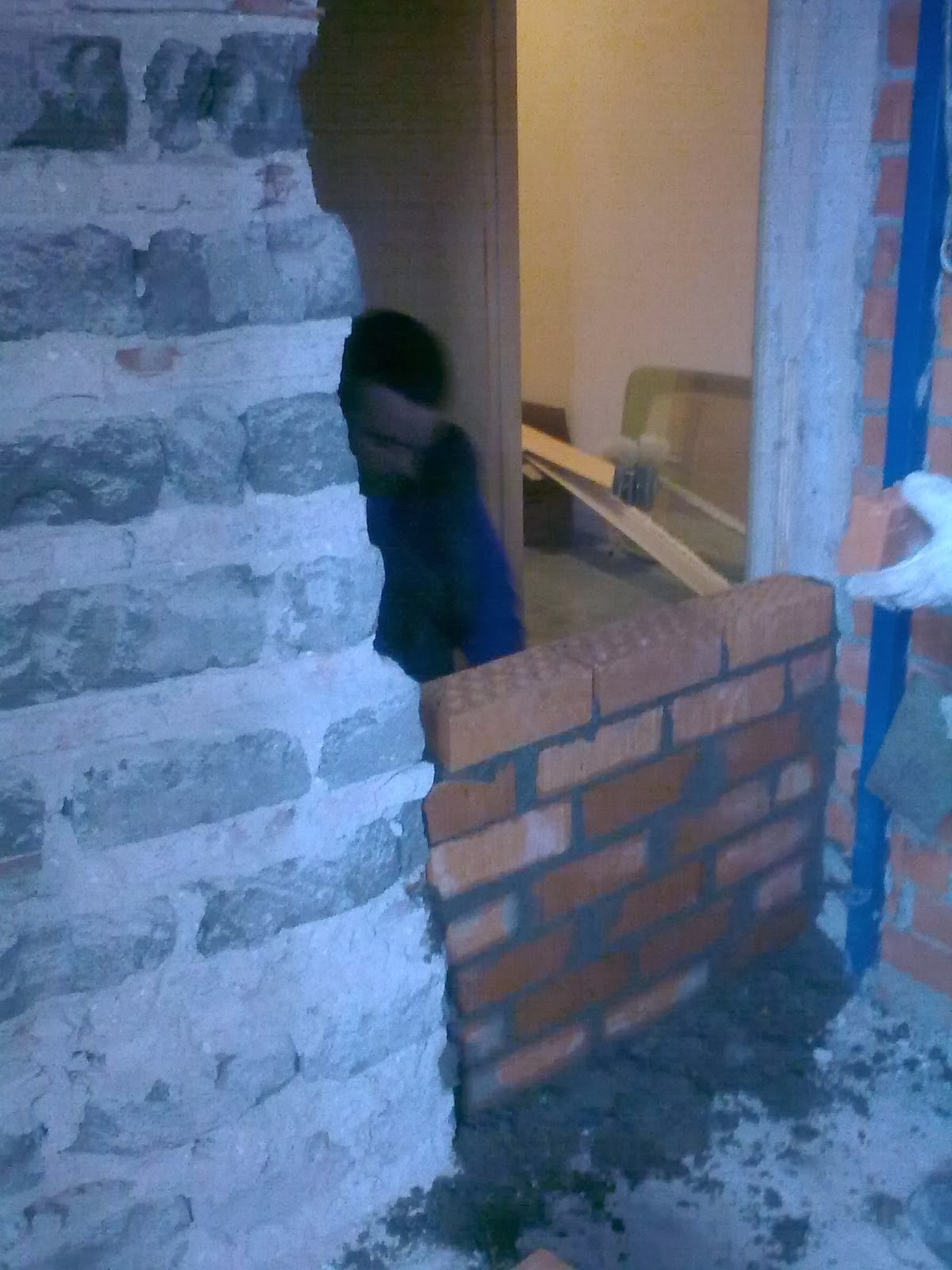 En la obra, terminan el enlucido del yeso del paramento vertical guarnecido de yeso del salón azul. Preparan cemento y suben ladrillos para cerrar el hueco de paso de la obra al cuarto de material de oficina del ayuntamiento, lo que antes era el hueco de paso a un baño de la vivienda del secretario.
