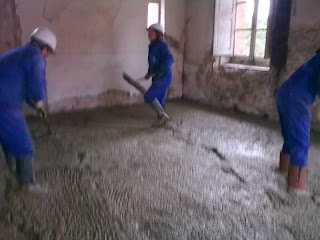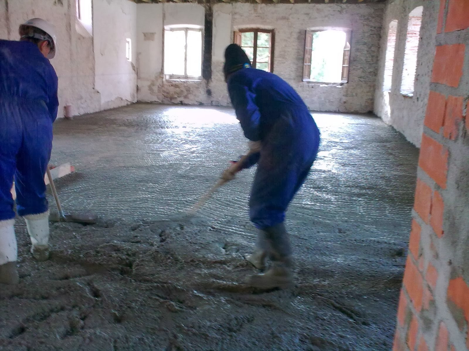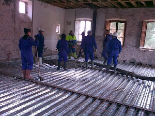 Llega la primera cuba con 8 m3 de hormigón y empezamos nuestro primer forjado, todos a una cargados de rastrillos, palas y con sus botas de agua se meten en el hormigón cómo los niños pequeños en el barro.